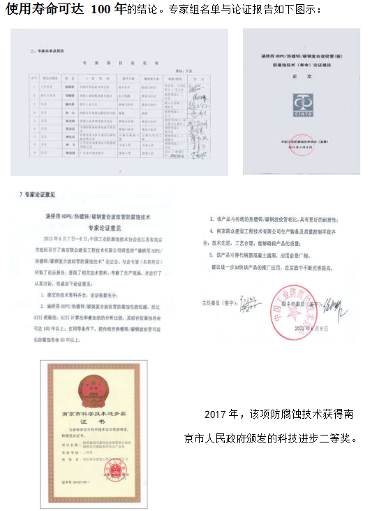 2010年,針對各地公路用熱鍍鋅波紋鋼管涵洞的腐蝕條件和行業(yè)防腐要求, 我公司與中國防腐蝕協(xié)會(huì )及南京工業(yè)大學(xué)、南京工程學(xué)院、中國石化集團金陵石化公司等單位合作研究,借鑒及創(chuàng )新了其它領(lǐng)域的高壽命的成熟防腐技術(shù),將有機材料與無(wú)機超硬質(zhì)礦物材料融合,成功的取得了埋地用鋼結構的熱浸鍍鋅加熱熔結塑料陶瓷的綜合防腐技術(shù),并已在國內高速公路埋地式鋼質(zhì)波紋管涵洞結構中運用,效果顯著(zhù),獲得行業(yè)好評。2017 年,該項技術(shù)獲得南京市人民政府頒發(fā)的科技進(jìn)步二等獎。
